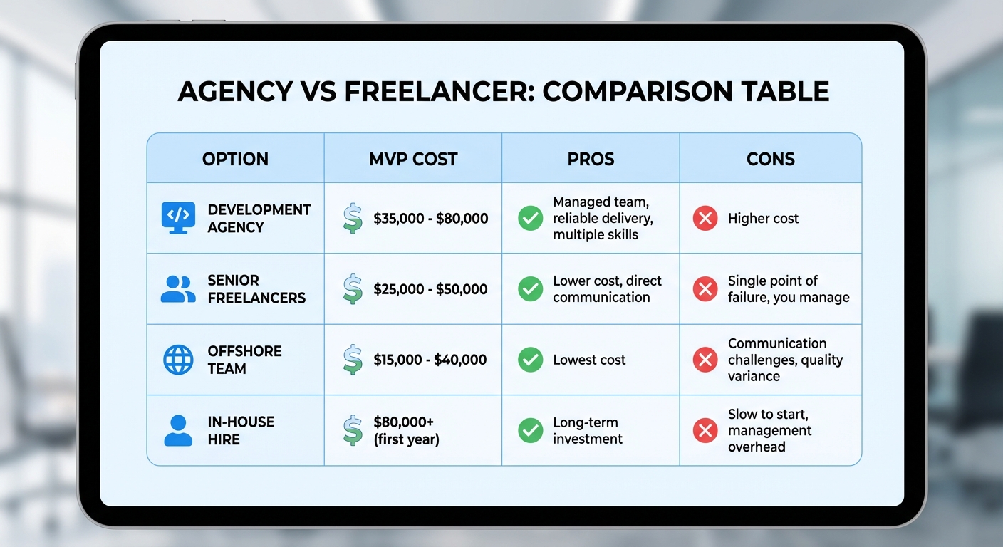 For most first-time founders, an experienced freelancer or small agency is the sweet spot. You get quality work without enterprise pricing.