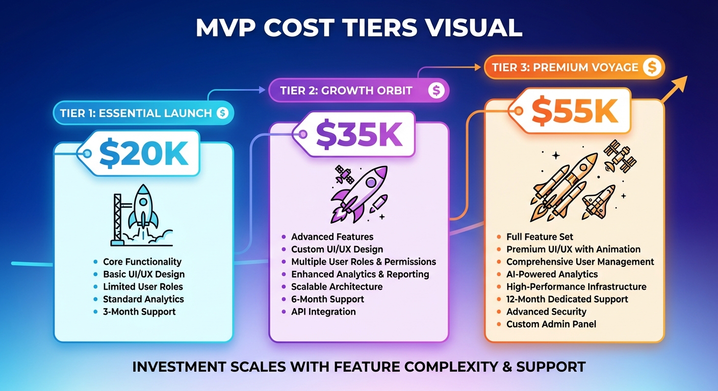 | Simple MVP (core feature only) | $20,000 - $35,000 | 6-8 weeks | Single-purpose tool, basic dashboard |