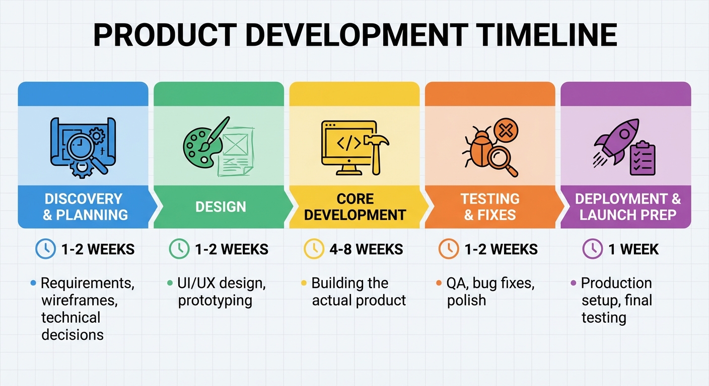 | Core development | 4-8 weeks | Building the actual product |